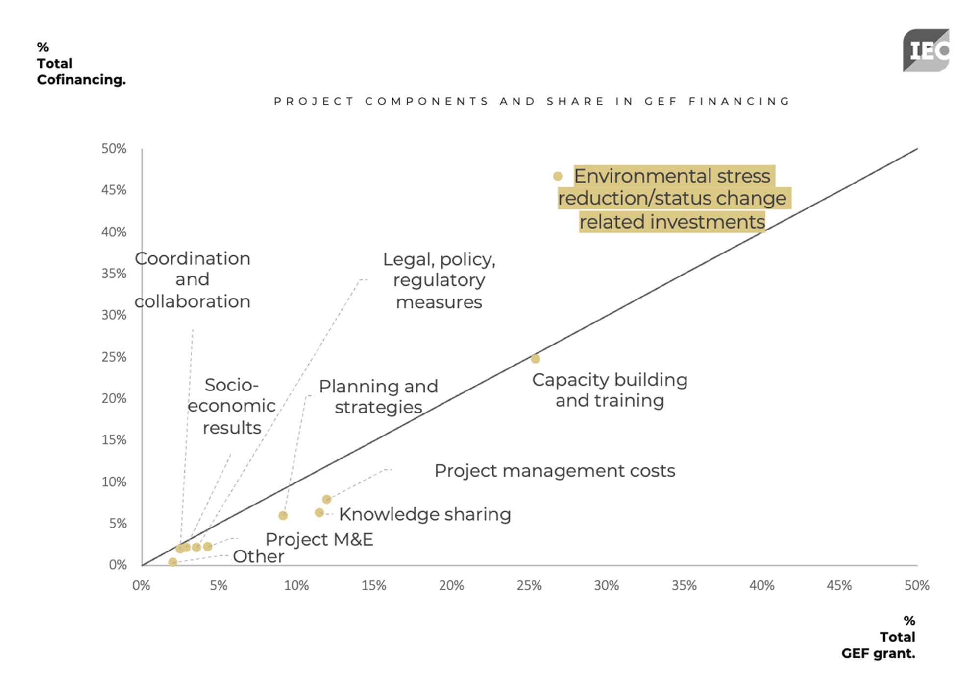 Investments in infrastructure, technology demonstration, and efficient equipment procurement also bring in more cofinancing. Similarly, projects that support mature technologies, generate revenue, and engage the private sector excel in attracting funds. In contrast, activities focused on capacity building, legal and policy development, and project monitoring attract less cofinancing and therefore need more support from the GEF.